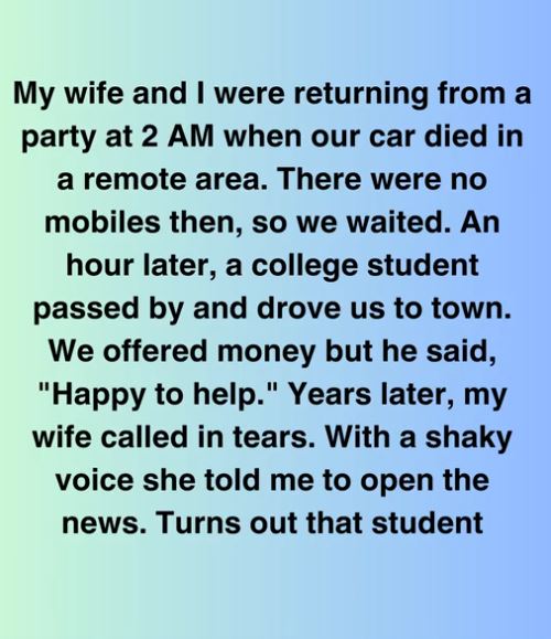 In 1992, my wife and I were stranded at 2 AM when our car broke down in a remote area. A college student, Naveen Varma, stopped to help, driving us to town without accepting payment. Years later, we saw him on the news—now a Congress member fighting corruption and advocating for rural education. His kindness lingered in our memory, tied to a scribbled note he left us.