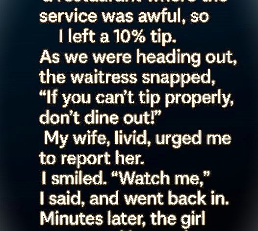 My wife and I went out to eat, and the service was terrible. Frustrated, I left a 10% tip. As we were leaving, the waitress snapped, “If you can’t tip properly, don’t dine out!” My wife was furious and told me to report her. I said, “Watch me,” and walked back inside.