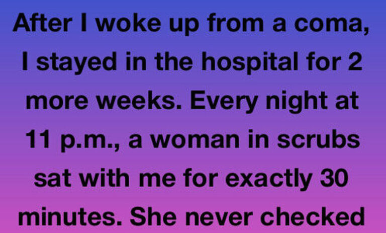 Every night at exactly eleven, a woman in scrubs came into my room, pulled up a chair, and talked for thirty minutes. She never checked my vitals or touched the machines—she just told ordinary stories about her garden, a piano recital, a lemon cake recipe. I barely had the energy to respond, but I listened like her voice was oxygen.