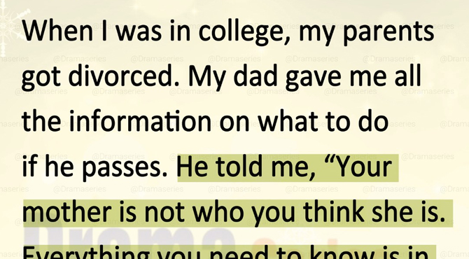 A week after the divorce, my dad asked me to go with him to the bank. It felt unusual—serious and quiet, without any explanation. He had me sign documents, access forms, and beneficiary papers. When we stepped outside, he paused and looked at me in a way I had never seen before. “If anything ever happens to me,” he said softly, “you’ll know what to do.” Then he added something that stayed with me for years: “Your mother is not who you think she is. Everything you need to know is in my deposit box.” After that, he never mentioned it again.